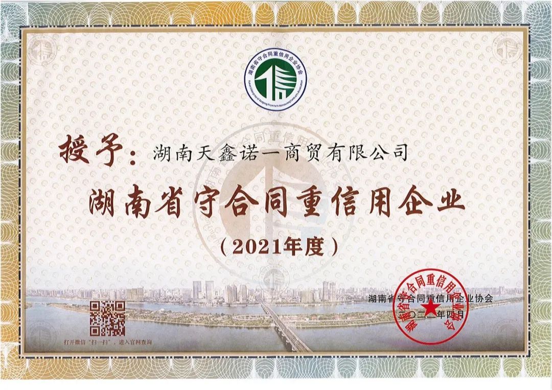 近期,天鑫諾一公司先后被湖南省守合同重信用企業(yè)協(xié)會(huì )、岳陽(yáng)市重合同守信用促進(jìn)會(huì )授予“2021年度守合同重信用企業(yè)”。 天鑫諾一公司將一如既往的堅持誠信經(jīng)營(yíng)、以誠立業(yè)、信譽(yù)取勝,把依法經(jīng)營(yíng)、誠信守約作為企業(yè)發(fā)展的基石,并…